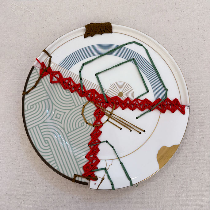 In a setting for eight, fragments of different plates are recomposed; their fractures are stitched together and kept visible. Each plate becomes “hybrid” and singular, bearing the traces of repair—where the seam reads both as wound and as suture.